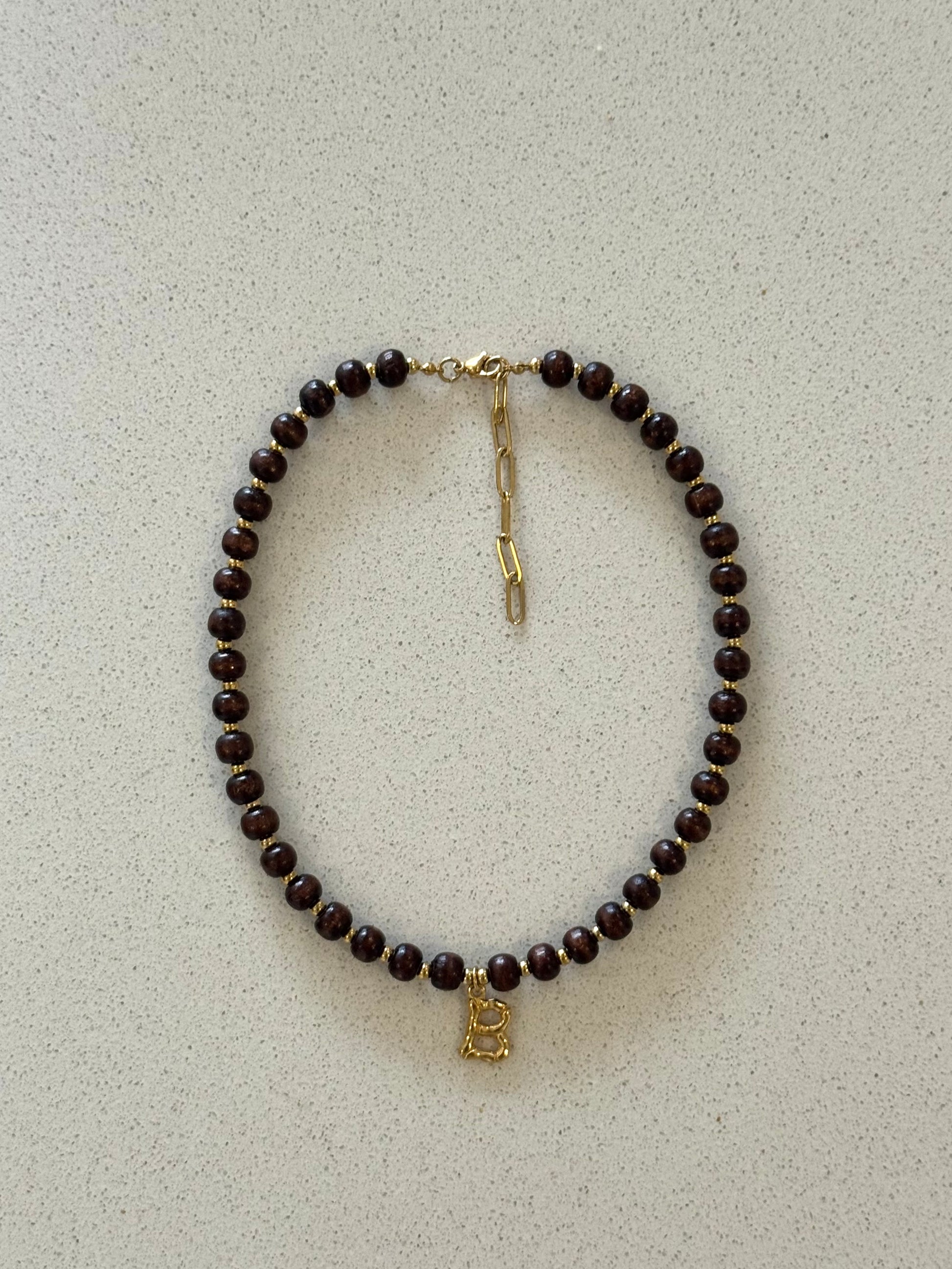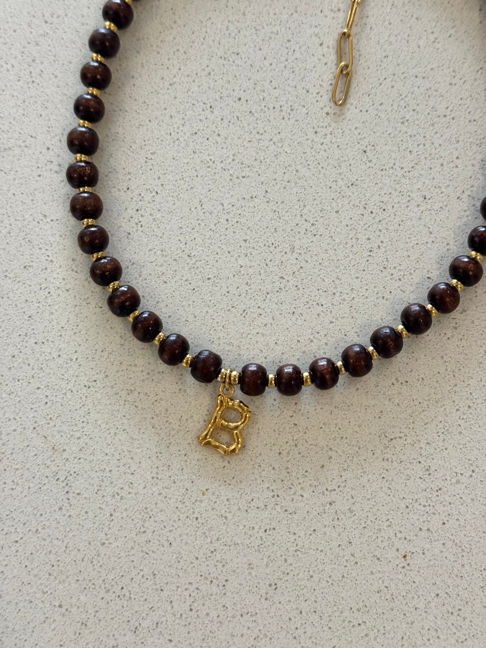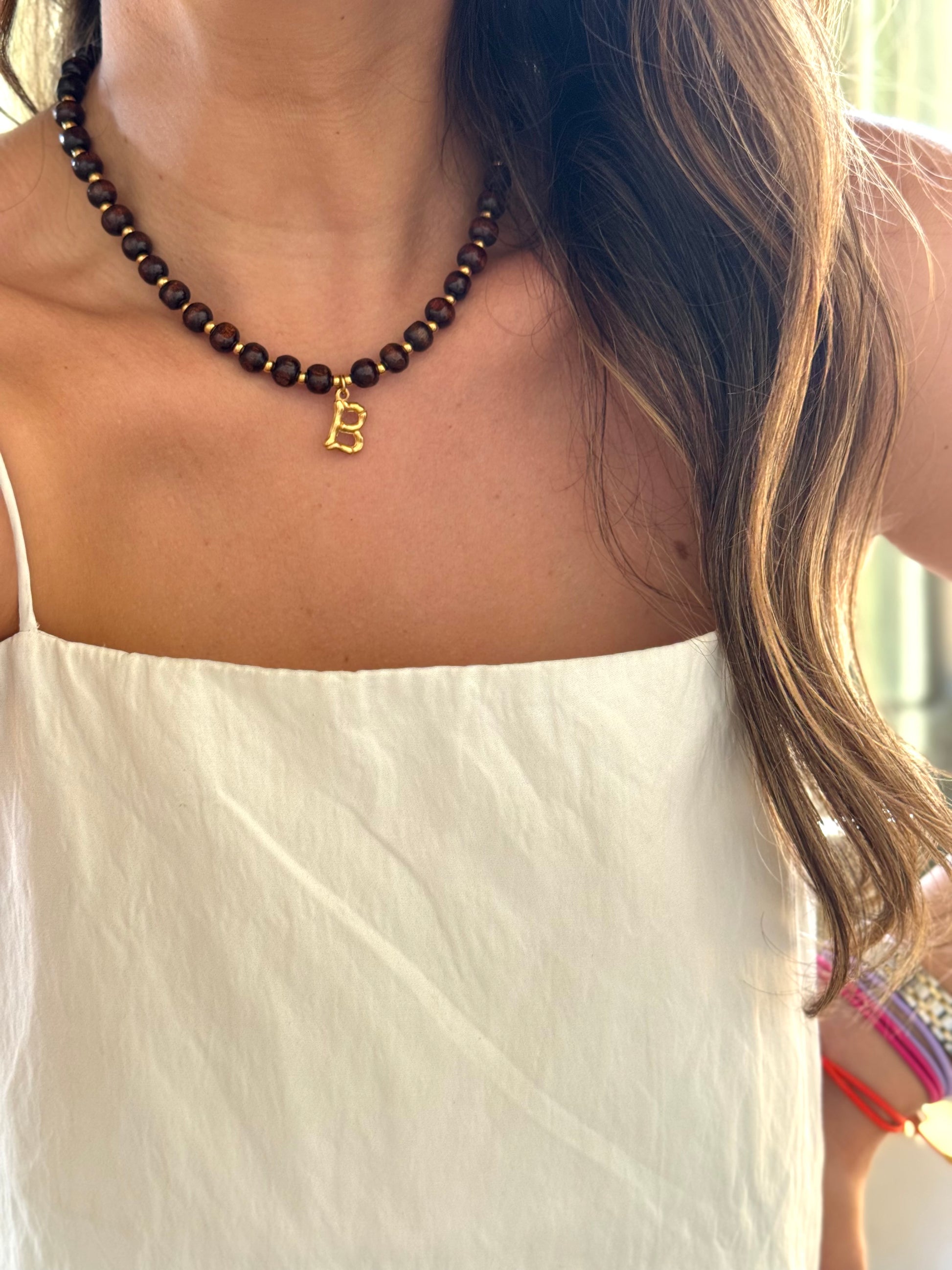 Colar com contas em madeira;